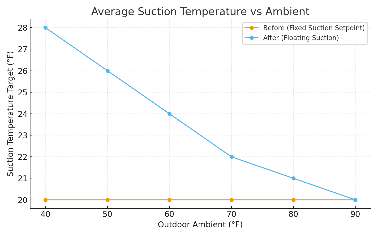 No coordination with defrost, reclaim, or other controls: If you enable floating suction without checking defrost system timing/fan performance/heat reclaim demand, you may reduce margin and trample savings.